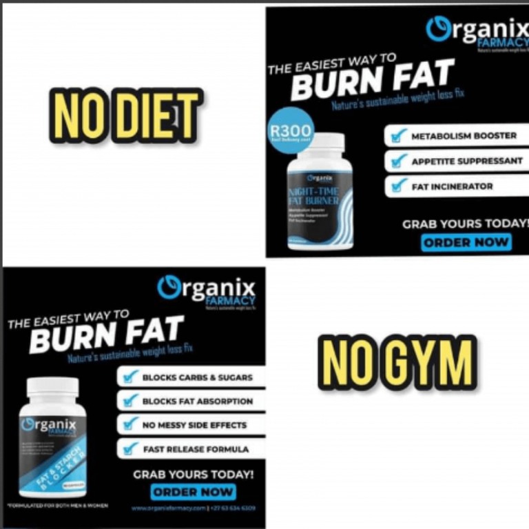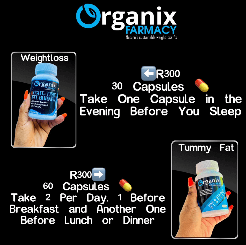 NIGHT-TIME FAT BURNER By Organix Farmacy R300.00 ORGANIC FAT BURNER FAT & STARCH BLOCKER By. Organix Farmacy R300.00 LOVE YOUR BODY & WALK PROUD WITH NO STRESS KEEPS YOU IN BEST SHAPE R250.00 BE THE BODY YOU WANT TO BE R300.00 KILL THAT TUMMY R300.00 KEEP YOUR BODY IN THE SHAPE YOU LIKE R300.00